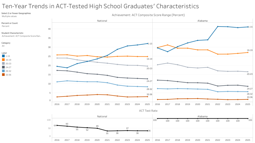 The average ACT score for 2025 Alabama public high school graduates decreased slightly compared to 2024, stalling what had been an incremental recovery from a post-Covid score drop. Nationwide, the average composite score was unchanged. Like in Alabama, the national average score remains below scores posted prior to the pandemic.