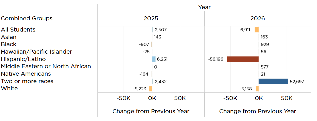 Overall, K-12 public school enrollment was down by 6,911 compared to the previous school year. Among subgroups, the number of students identifying as Hispanic dropped by 56,196, while the number identifying as Two or more races climbed by 52,627. The combined total of the two groups dropped 3,569 between 2025 and 2026. The number of White students also dropped by 5,158. Meanwhile, the number of Asian Students, Black Students, Native American students, and students of other races or ethnicities increased.