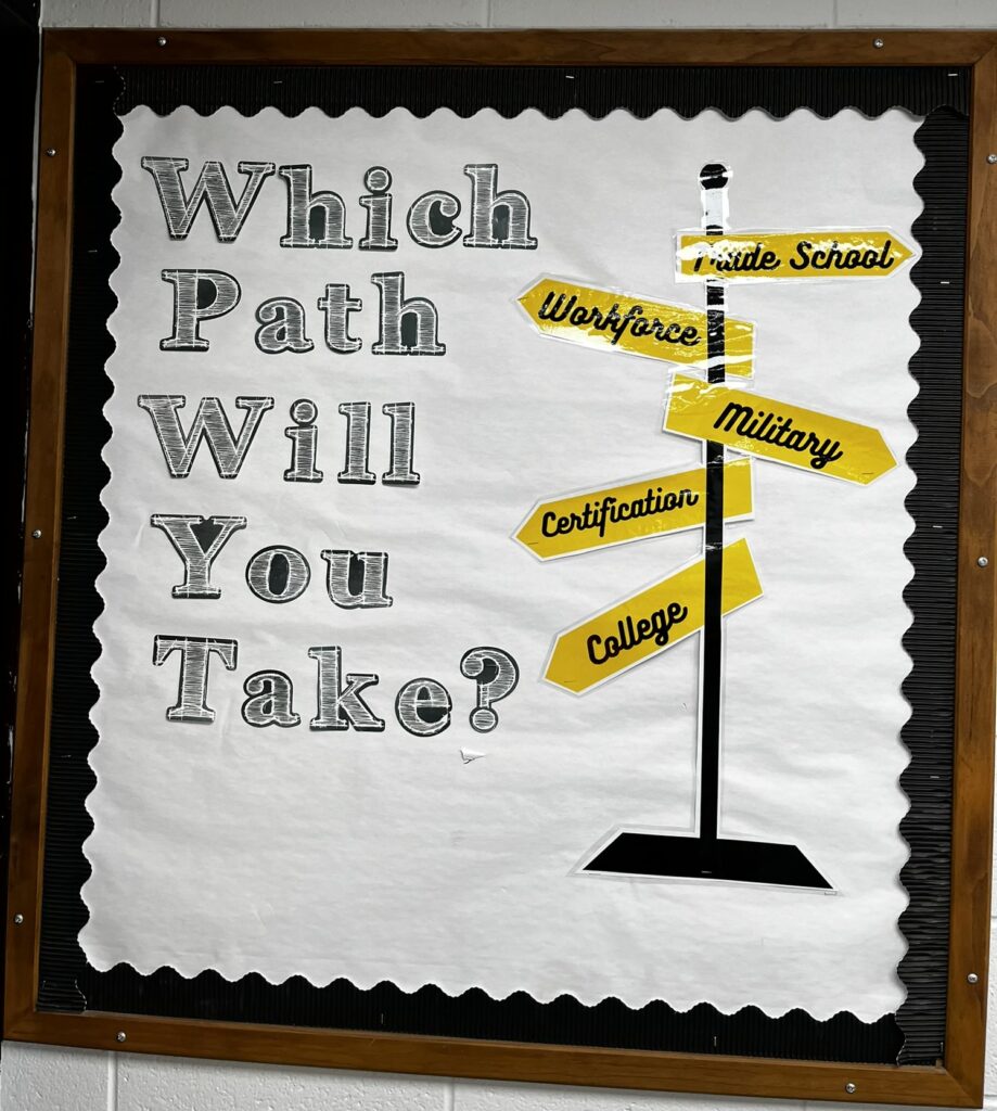 Once at the high school, the counseling suite is highly visible, located at the top of the high school stairs, with glass windows for walls. The visibility serves as a reminder to students of the stream of opportunities available. Opp has a regular stream of visits from college, employment, and military recruiters.